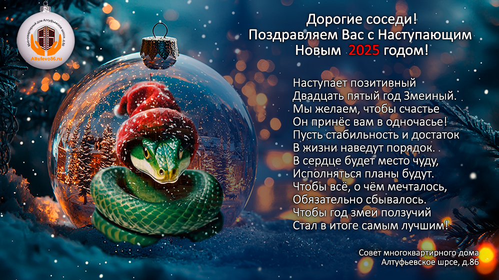 16.02.2025 г. - "Высококвалифицированные" специалисты из средней Азии запустили новое направление Яндекс.Мусор в нашем дворе. 31.12.2024 г. - Дорогие соседи, поздравляем Вас с Наступающим Новым 2025 годом!