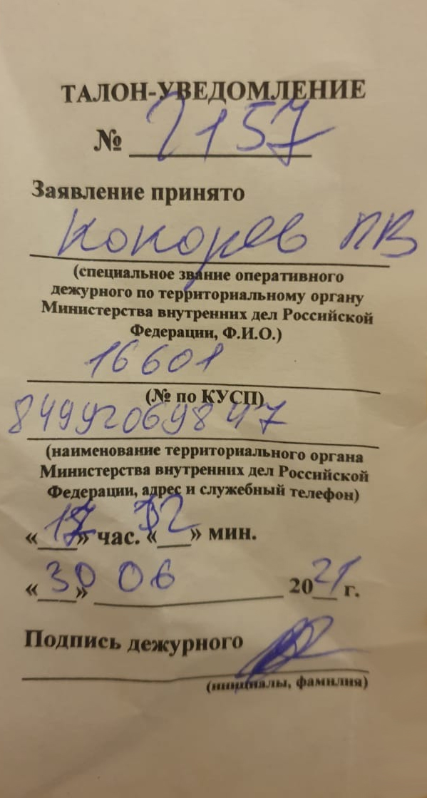 30.06.2021 г. в 17:30 - Подали заявление. Получили талон № 2157.