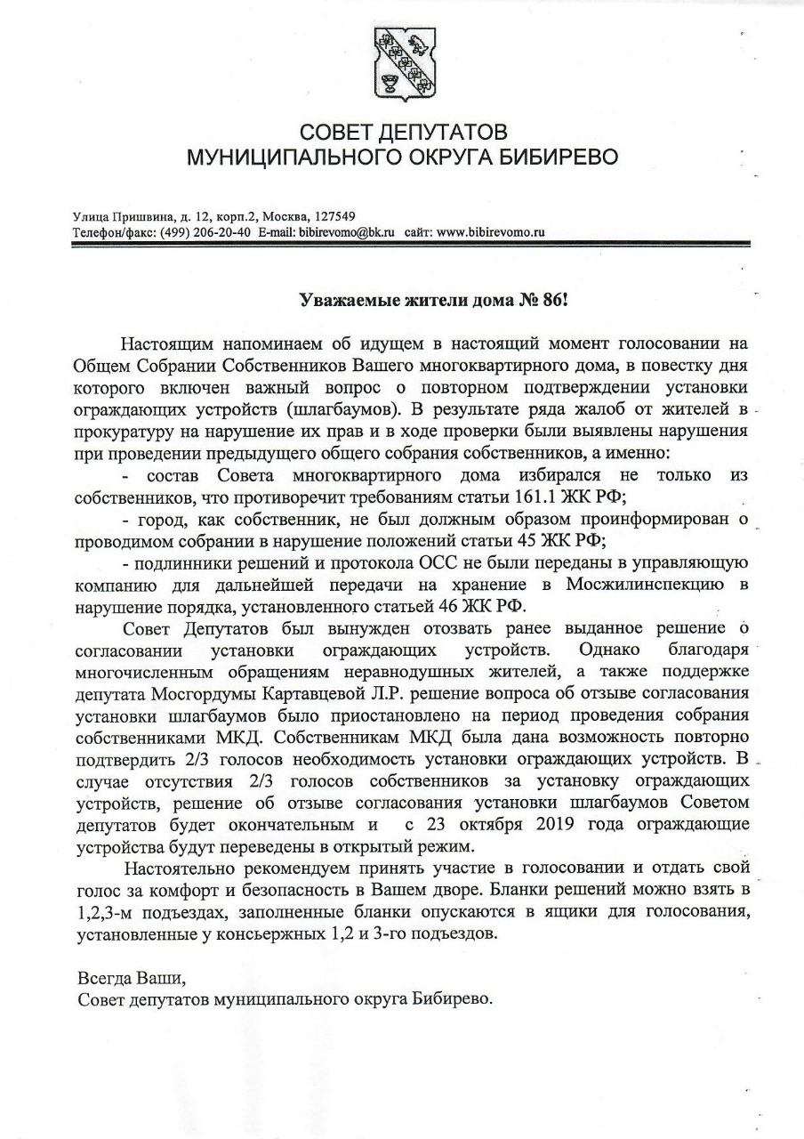 Совет Депутатов был вынужден отозвать ранее выданное решение о согласовании установки ограждающих устройств. Однако благодаря многочисленным обращениям неравнодушных жителей, а также поддержке депутата Мосгордумы Картавцевой Л.Р. решение вопроса, об отзыве согласования установки шлагбаумов было приостановлено на период проведения собрания собственниками МКД. Собственникам МКД была дана возможность повторно подтвердить 2/3 голосов необходимость установки ограждающих устройств. В случае отсутствия 2/3 голосов собственников за установку ограждающих устройств, решение об отзыве согласования установки шлагбаумов Советом депутатов будет окончательным и с 23 октября 2019 года ограждающие устройства будут переведены в открытый режим.