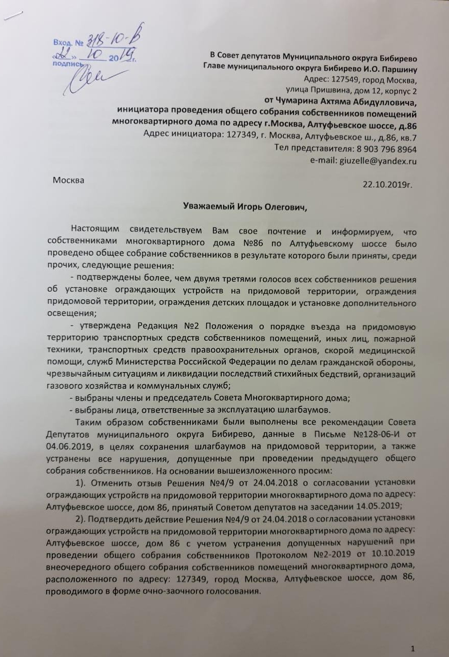 Таким образом собственниками были выполнены все рекомендации Совета Депутатов муниципального округа Бибирево, данные в Письме №128-06-И от 04.06.2019, в целях сохранения шлагбаумов на придомовой территории, а также устранены все нарушения, допущенные при проведении предыдущего общего собрания собственников. На основании вышеизложенного просим: