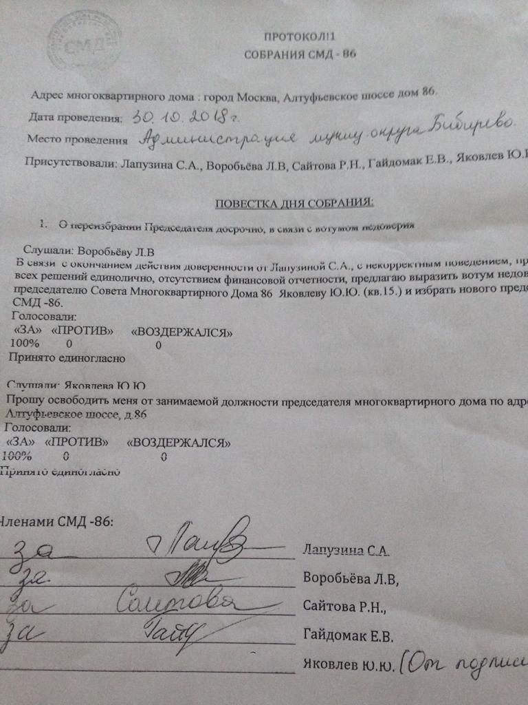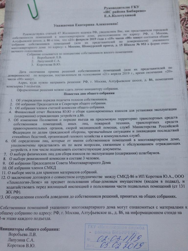 Главная / 21 февраля 2019 г. - Общее Cобрание Cобственников №2Уважаемые соседи!21 февраля 2019 года, инициаторами Лапузиной С.А. и Воробьевой Л.В. была проведена очная часть Внеочередного Общего Собрания Собственников помещений многоквартирного дома по адресу: г. Москва, Алтуфьевское шоссе, д.86. Собрание проходило по адресу: г. Москва, Алтуфьевское шоссе, д.86, в холле 1-го этажа 5-го подъезда c 19:00 до 21:00. Протокол собрания инициаторами собрания не предоставлен. Опубликованные документы: