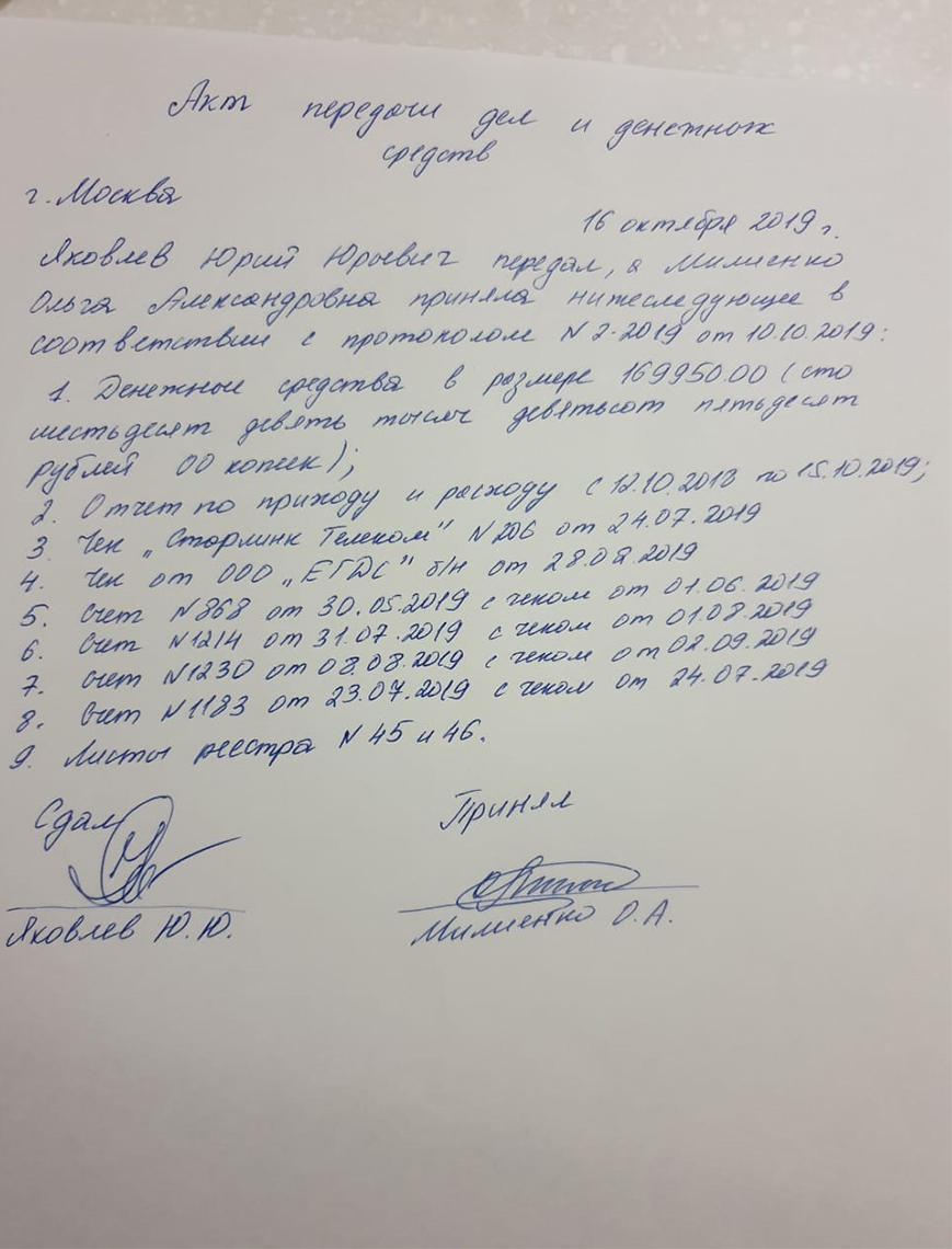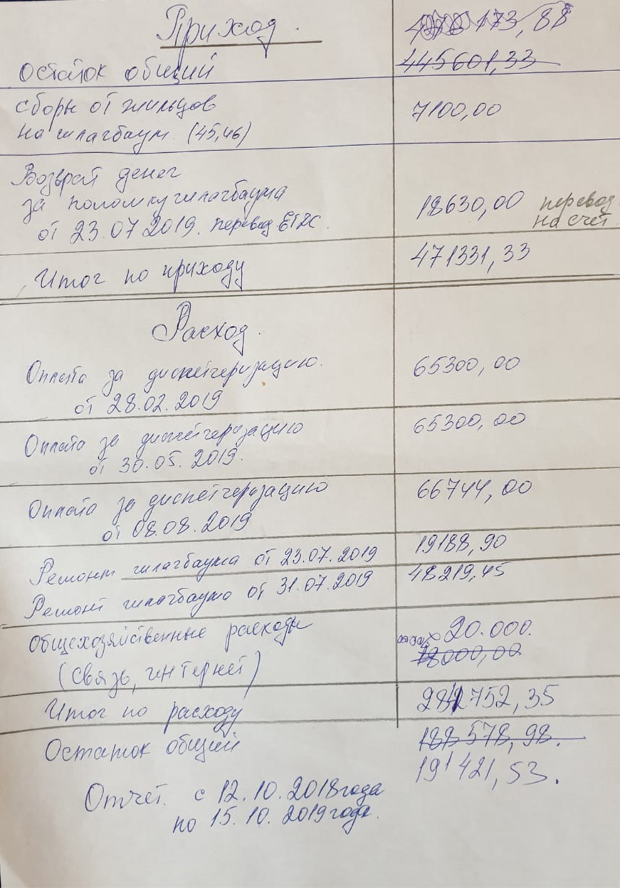Фото. Предоставленный финансовый отчет от председателя СМД ОСС №1 Яковлева Юрия Юрьевича о финансовом состоянии дел: