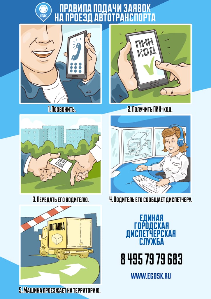 1. Вам необходимо предупредить сотрудника службы такси или доставки о том, что дом находится на огороженной территории и для въезда ему необходимо связаться с Вами, когда его автотранспортное средство подъедет к шлагбауму. Вы, как житель дома, у которого есть доступ к управлению шлагбаумом, сами принимаете решение по открытию шлагбаума с помощью телефонного звонка. 2.Если не удалось открыть барьер самостоятельно, Вы можете осуществить проезд данных служб через разовую заявку. Для получения заявки необходимо заранее позвонить на номер ЕГДС 8(495)797-96-83 или 8(495)369-22-99 со своего зарегистрированного телефона и в автоматическом режиме получить пятизначный код проезда. Затем этот код передать водителю. Водитель должен либо самостоятельно набрать код на кодонаборной панели либо назвать код заявки диспетчеру, нажав кнопку вызывной панели. Если код заявки назван верно и не использован Вами ранее, диспетчер откроет барьер. Код заявки действует на один проезд одного автомобиля в течение 24 часов со времени получения заявки.