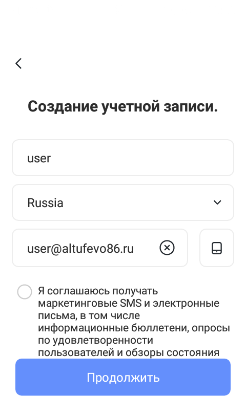 6. В появившемся окне вводим данные: Ваше имя, регион (обязательно указываем Russia из выплывающего списка) и Ваш e-mail. Можно произвести регистрацию при помощи мобильного телефона, в этом случае нажмаем на значок смартфона и указываем мобильный телефон. Убираем галочку, если она стоит, чтобы не получать рекламные сообщения и нажимаем «Продолжить».