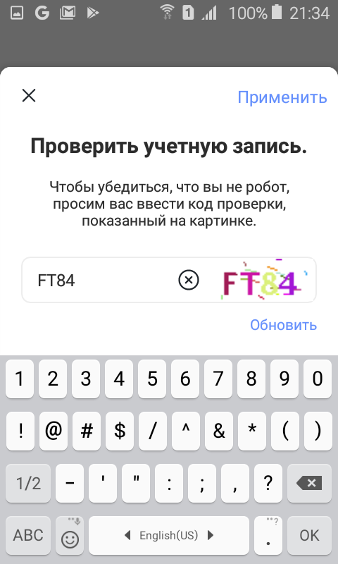 9. Далее система проверит, что Вы не робот и попросит Вас ввести код с картинки, после чего жмем «Применить».