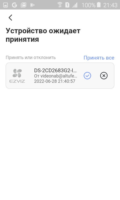 15. Нажимаем на сообщение «У вас есть общие устройства». Появится окно со списком доступных Вам камер. Камер должно быть 16 штук. На картинке указана только одна. Нажимаем «Принять все».
