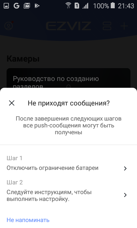 16. После появится окно с настройками. Здесь можно настроить уведомления о событиях, а также отключить экономию батареи. Чтобы телефон не сигнализировал Вам на каждое движение в кадре рекомендую данный пункт оставить без изменений и нажать на «Не напоминать».